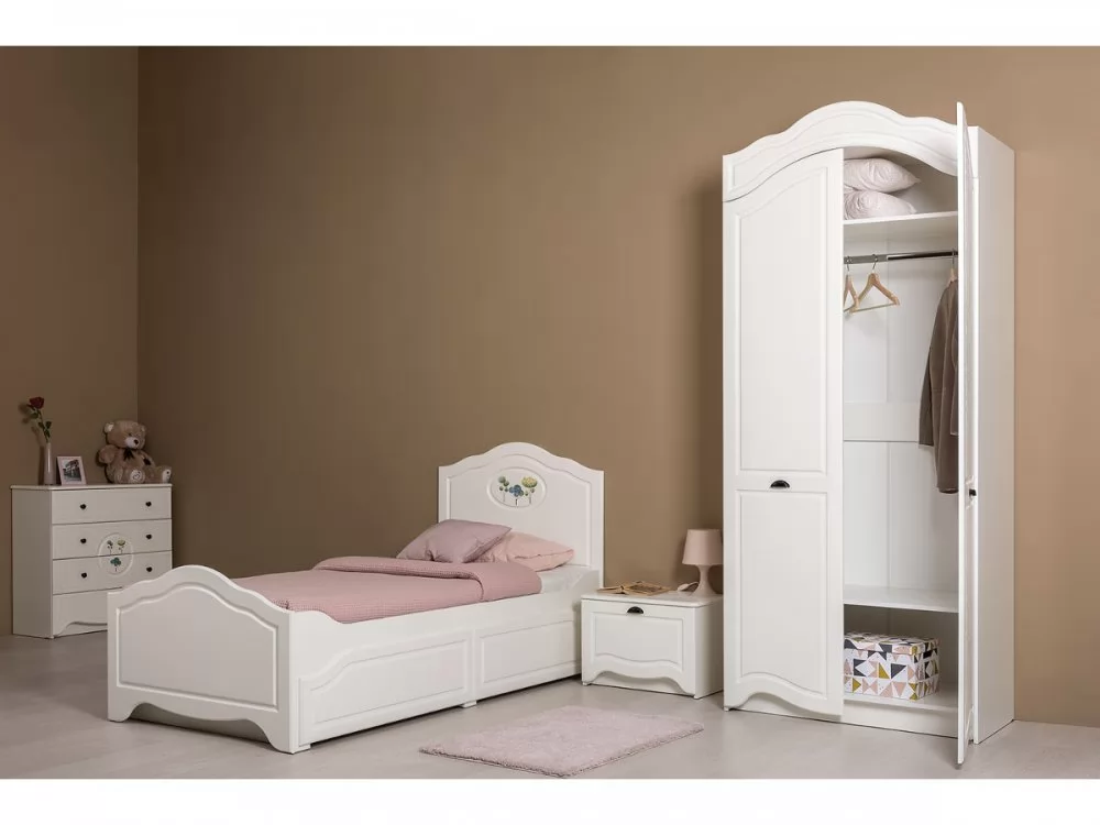 В коллекции Роуз 4 элемента с разным функционалом, которые помогут грамотно сформировать пространство детской комнаты: кровать с большим спальным местом и емкими выкатными ящиками будет шикарно смотреться при любой постановке в интерьере; вместительный комод сможет идеально распределить вещи и игрушки; просторный шкаф сохранит в порядке детский гардероб, а лаконичная, но немаловажная тумбочка отлично дополнит