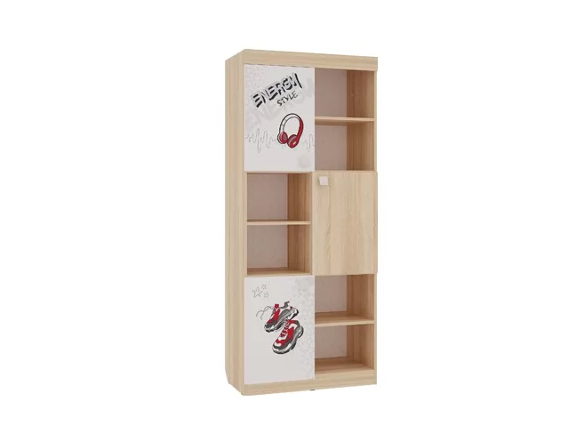 Стеллаж с открытыми и закрытыми полками идеально подойдет для книг, игрушек и мелочей. Эффектный принтерный рисунок на фасадах выдержан в общем стилистическом решении. Рисунок устойчив к истиранию и ультрафиолету. Детская «Энерджи»- все, что нужно для современного подростка!