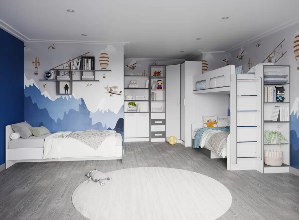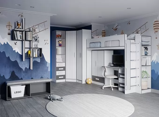 Кровать чердак спроектирована под одно спальное место и может дополняться вторым спальным местом (кровать с ящиками) или рабочим местом (шкаф малый, письменный стол) .Полку навесную можно повесить как горизонтально так и вертикально. Тумбу открытую можно доукомплектовать мягким сиденьем из ткани велюр цвета Серый. Все модули из коллекции имеют кромку серого цвета. Из ЛДСП Графит Серый выполняются отдельные элементы: