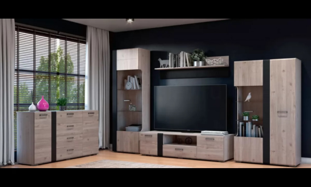 Множество модулей из ЛДСП текстуры дуб Нельсон позволит сделать уютной любую гостиную. Вас покорит мягкий, но при этом благородный и теплый оттенок фасадов. Легкая и одновременно строгая коллекция декорирована фрезерованной планкой в цвете Смоки софт.