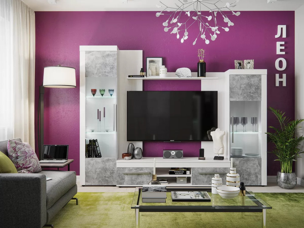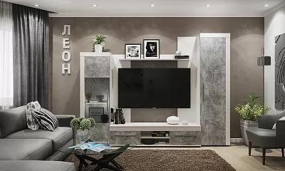 Законодатели интерьерных тенденций “сдали” бетону кухню, ванную, облицовку стен и пола, а теперь уже и мебель для других комнат. Особенно гармонично материалы “под бетон” выглядят в лофтах - популярных однокомнатных планировках недорогих квартир, ориентированных на молодую аудиторию. Спокойный и мужественный “бетонный” декор Ателье Светлый на фасадах стенки ЛЕОН облечен в раму из древесного декора Ясень Анкор светлый.