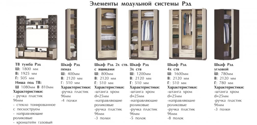 Классическая модульная система «Рэд», несомненно дополнит собой любой интерьер квартиры или дома. В гостиной есть все необходимые элементы для оформления комнаты. Стеклянные витрины создают современный и стильный образ вашему дому.