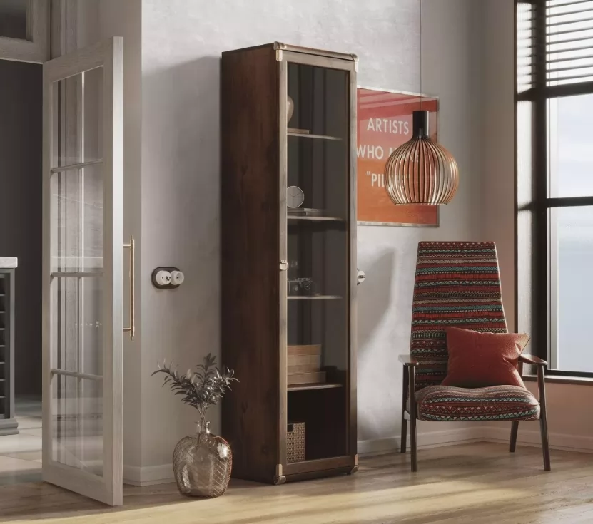 Шкаф - витрина ИНДИАНА JWIT 1d — это воплощение стиля и надежности. Изящные металлические уголки подчеркивают его строгий силуэт, а насыщенный оттенок дуба саттер с текстурой под состаренное дерево придает мебели благородство и шарм. Высококачественное ЛДСП класса E0,5 обеспечивает экологичность и безопасность, делая этот шкаф идеальным выбором для вашего дома. Надежная европейская фурнитура гарантирует долговечность и комфортное использование. Откройте для себя сочетание элегантности и функциональности со шкафом ИНДИАНА JWIT 1d.