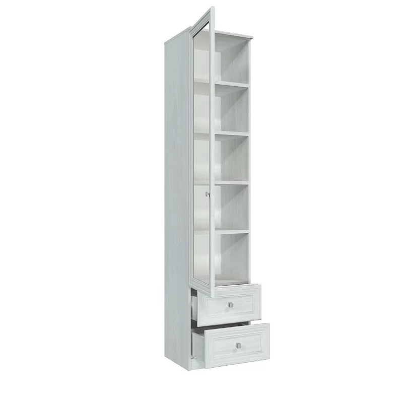 Книжный шкаф высотой 2107 мм поможет правильно организовать хранение книг и письменных принадлежностей. За стеклянным фасадом четыре, регулируемые по высоте, полки из ЛДСП толщиной 22 мм. Тонированное стекло защитит книги от вредного воздействия солнечных лучей и убережет их от пожелтения. Стеклянный фасад перенавешивается. Два выдвижных ящика оснащены шариковыми направляющими. Книжный шкаф обязательно крепится к стене за подвесы.