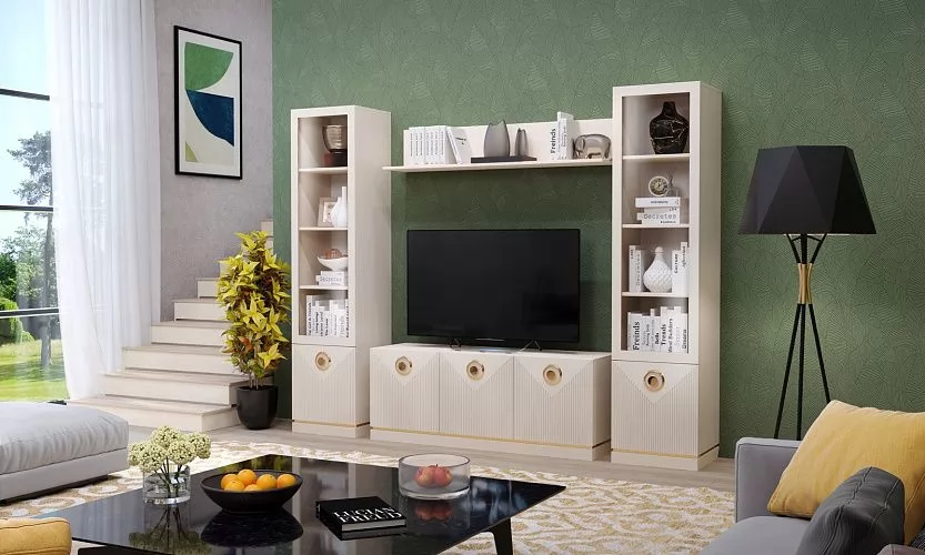 - конструкция модуля предполагает возможность закрытого и открытого хранения, за стеклодверью предусмотрены три полки, где можно поместить красивые сувениры, книги и фото, а в нижней части закрытое отделение с дверкой; - петли дверок имеют доводчик для плавного движения и закрывания; - мебель безопасна для дома благодаря экологичным материалам , таким как МДФ и ЛДСП класса эмиссии Е1.