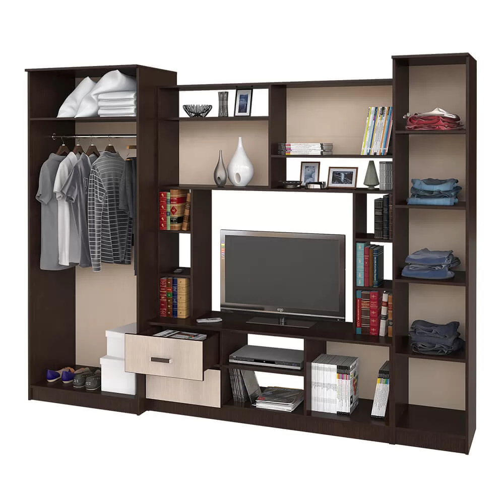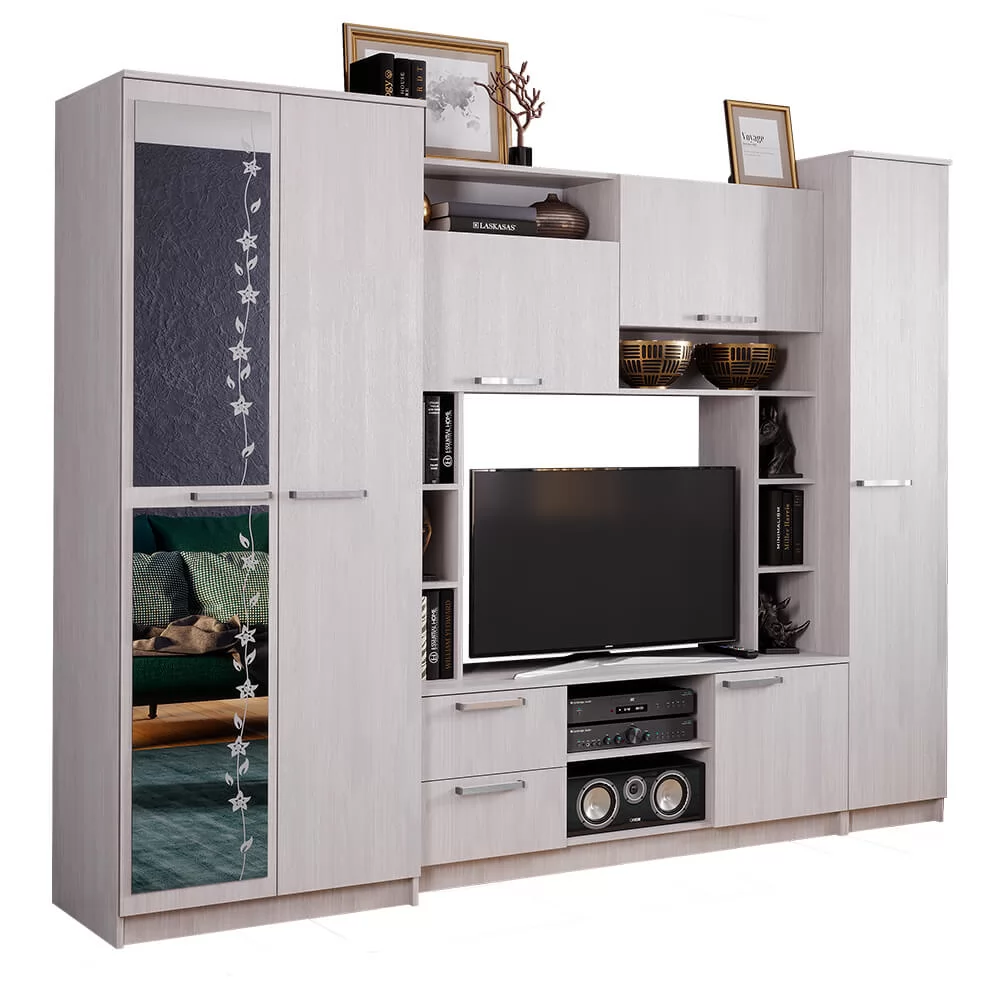 Гостиная «Флора» невероятно вместительный вариант. В ней вы сможете расположить телевизор, всю необходимую аудиотехнику, а верхние и нижние ящики прекрасно подойдут для документов и личных вещей. Кроме того, модель гостиной Флора имеет два полноценных шкафа, один из которых двустворчатый и оснащен штангой для вешалок с вашей одеждой.