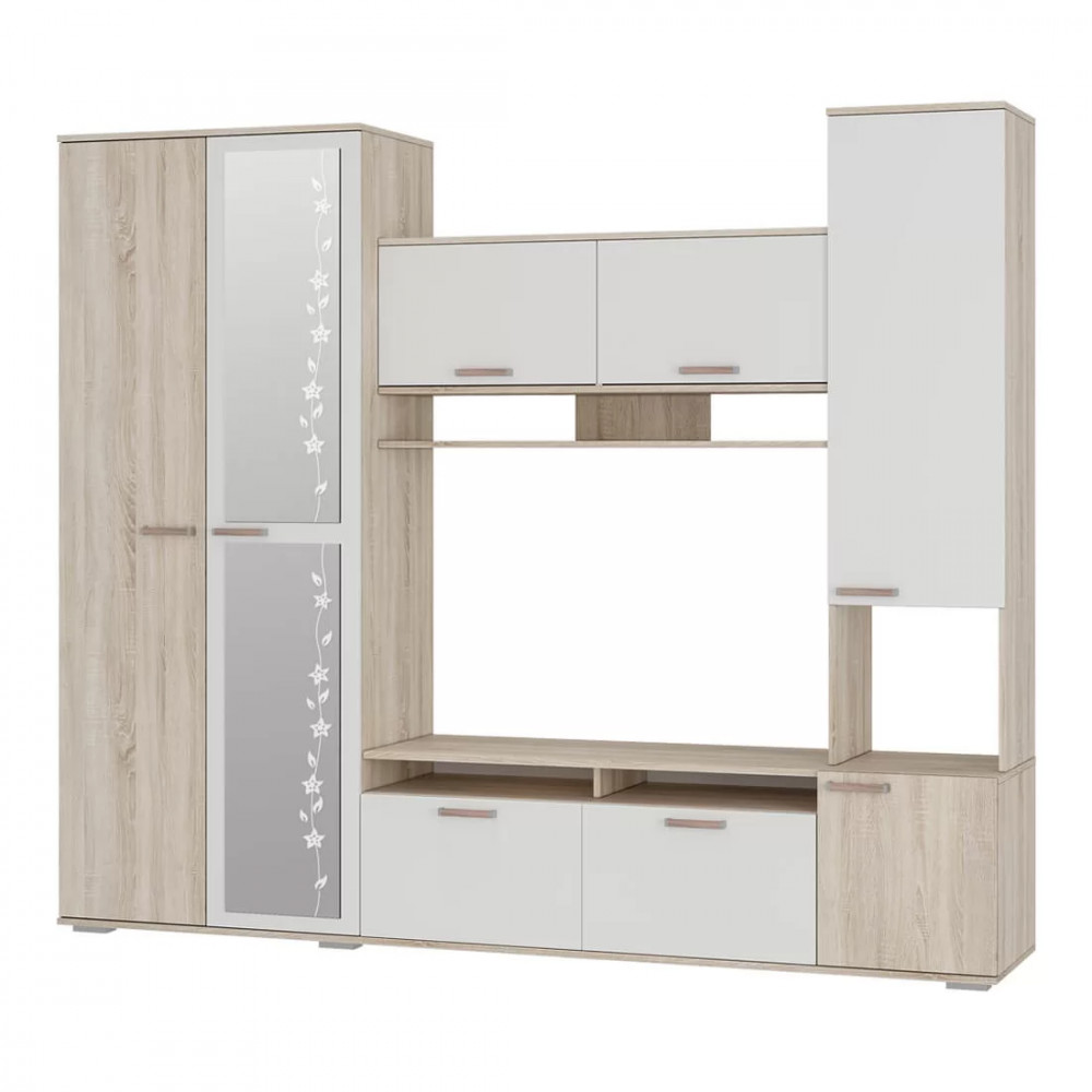 Контрастное сочетание фасадов белого цвета с древесной фактурой дуб сонома, а также отделка зеркалами станут ярким акцентом любого интерьера.