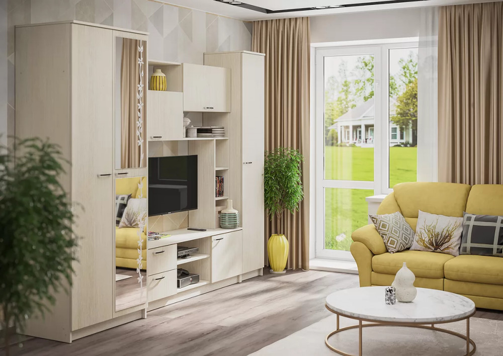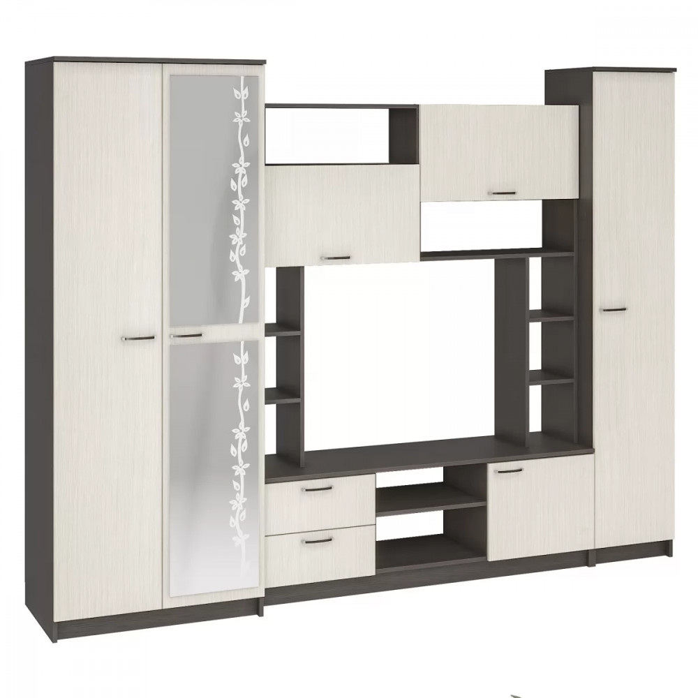 - Гостиная состоит из трёх модулей (шкаф платяной, шкаф бельевой, средняя секция),