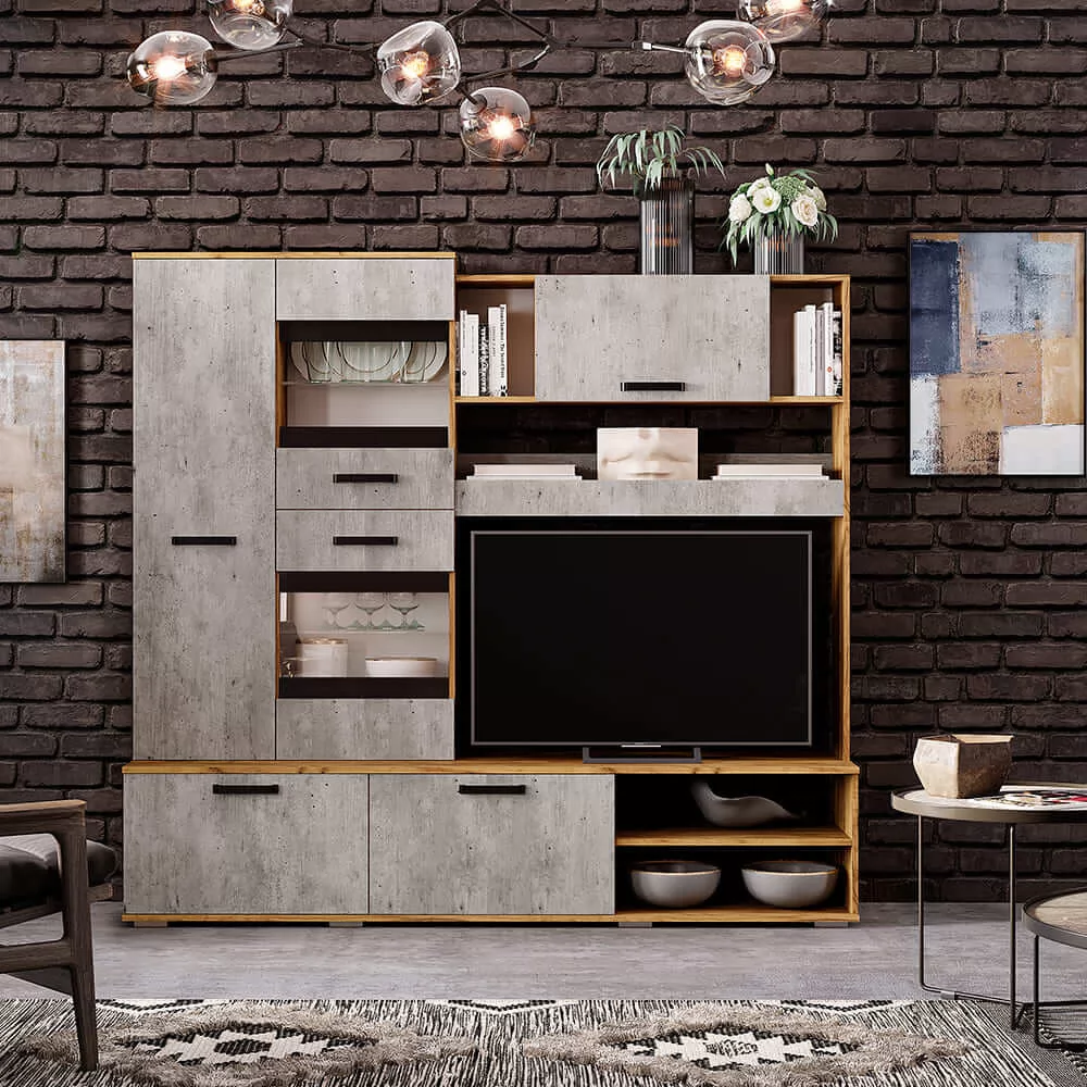 -высококачественное ЛДСП цвета крафт сочетается с фасадами, эмитирующими бетонную поверхность,