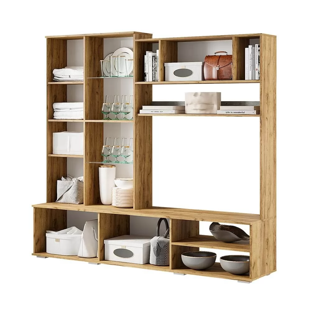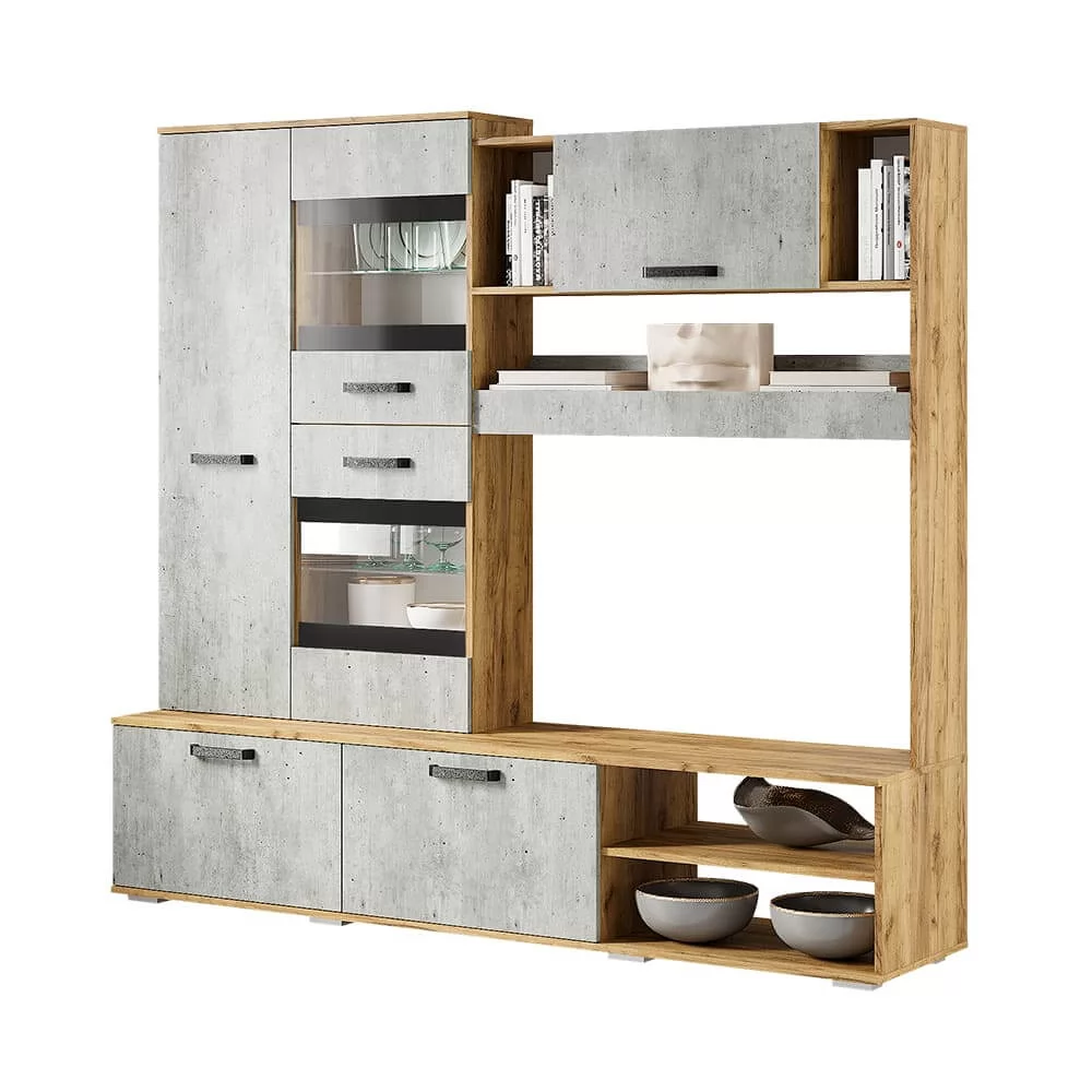 -гостиная наполнена закрытыми нишами и открытыми полками, а также несколькими зонами со стеклянными дверцами, что облегчает конструкцию.