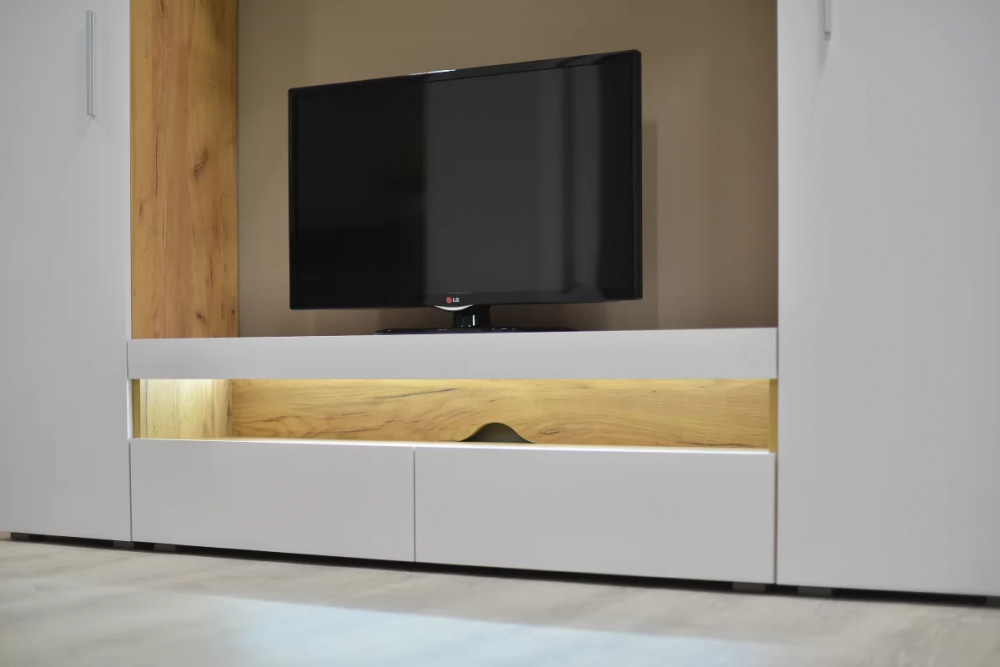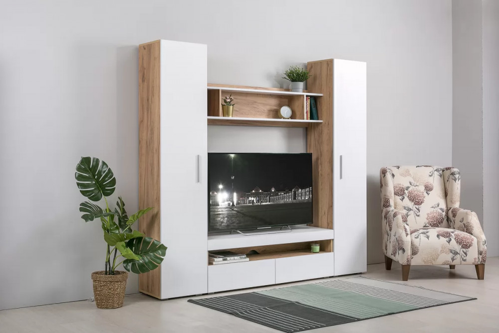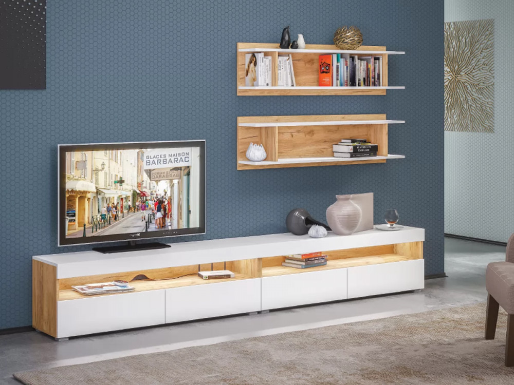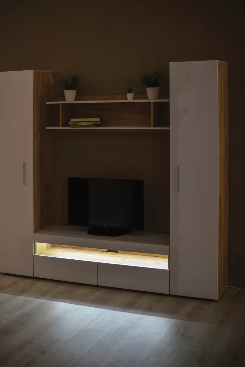 Белый цвет – основа большинства стилей. Это касается и классики, и современных ультрамодных трендов. Сложно найти что-то более универсальное и практичное для оформления современных гостиных. Гостиная "Альба 3" с белыми глянцевыми фасадами наполняет комнату светом, визуально расширяет пространство. Корпус модулей в текстуре светлого дерева будет уместен в интерьере в скандинавском или эко стиле.