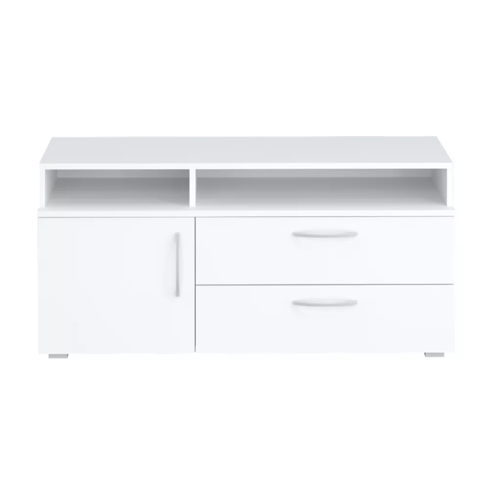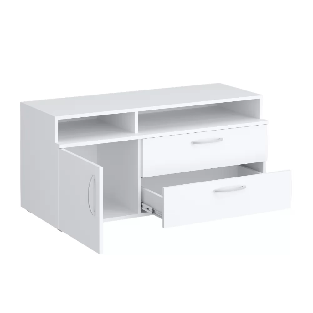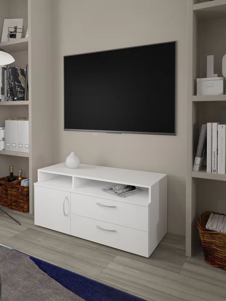 Современная низкая тумба под ТВ в универсальном белом цвете станет приятным акцентом вашей гостиной. Открытые полочки и закрытая зона для хранения - практичное сочетание. Выкатные ящики работают на шариковых направляющих полного выдвижения - тихие, надёжные и позволяющие увидеть всё пространство ящика целиком.