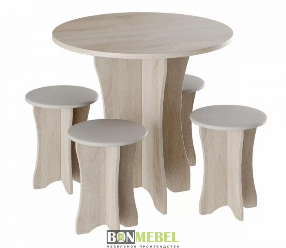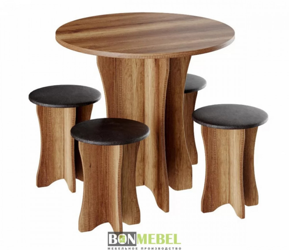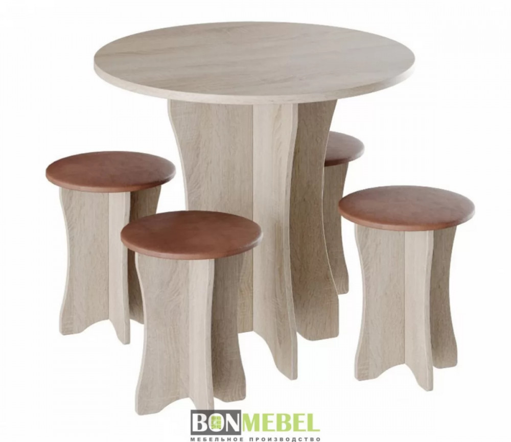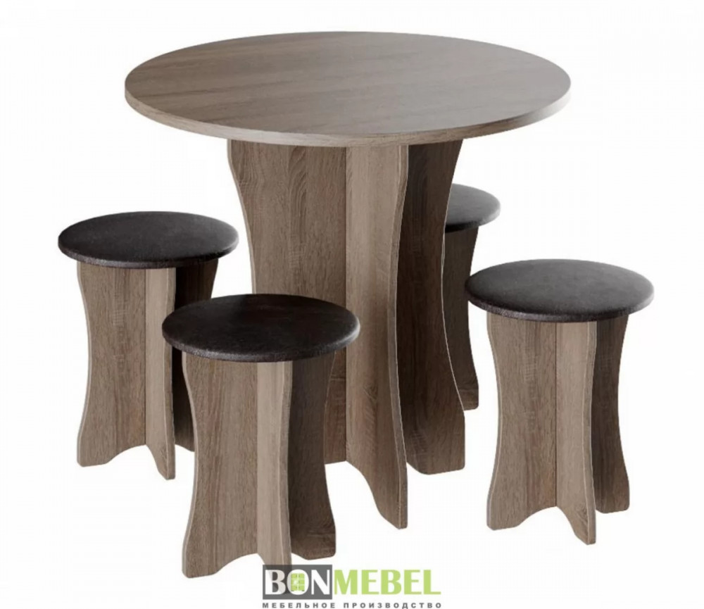 Обеденная группа Тип-6 отличается простым, но привлекательным стилем. Композиция без труда вольется в любой современный интерьер, сделав кухонное пространство более практичным и уютным. Обивка из экокожи обладает износостойкостью, устойчивостью к загрязнениям и не прихотлив в уходе. Мягкие сиденья табуретов имеют мягкий и упругий слой, что создает максимально комфортные условия для сидящего. Классическое контрастное сочетание цветов сделает любой интерьер интересным и гармоничным. Для изготовления моделей используется прочная ЛДСП. Обивка табуретов произведена из искусственной кожи.
