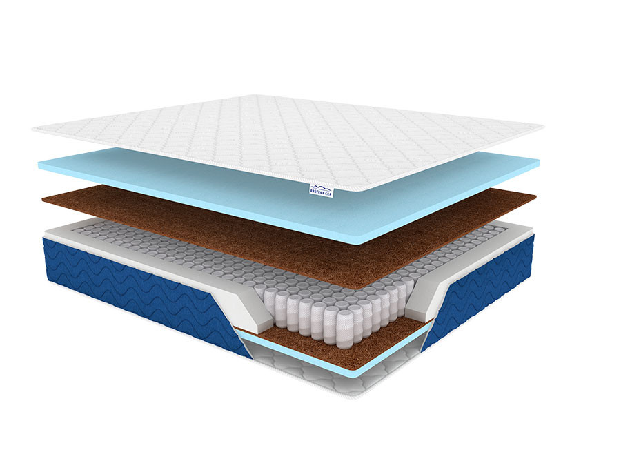 Состав: Пенополиуретан - 3 см/Био-кокос 1 см/Блок независимых пружин/Био-кокос 1 см/ Пенополиуретан - 3 см