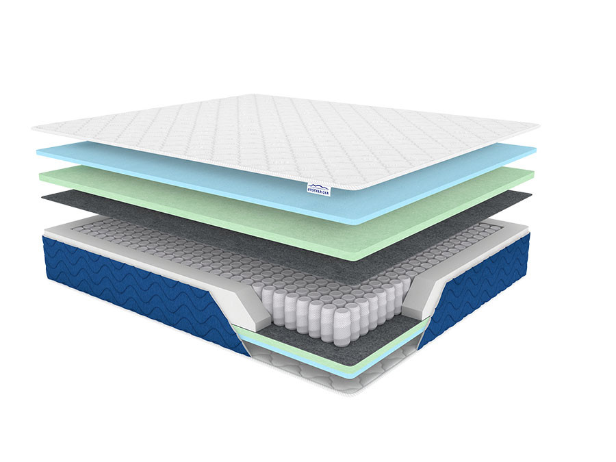 Состав: Пенополиуретан - 2 см/Ортофайбер 3 см/Термовойлок/Блок независимых пружин/Термовойлок/Ортофайбер 3 см/ Пенополиуретан - 2 см