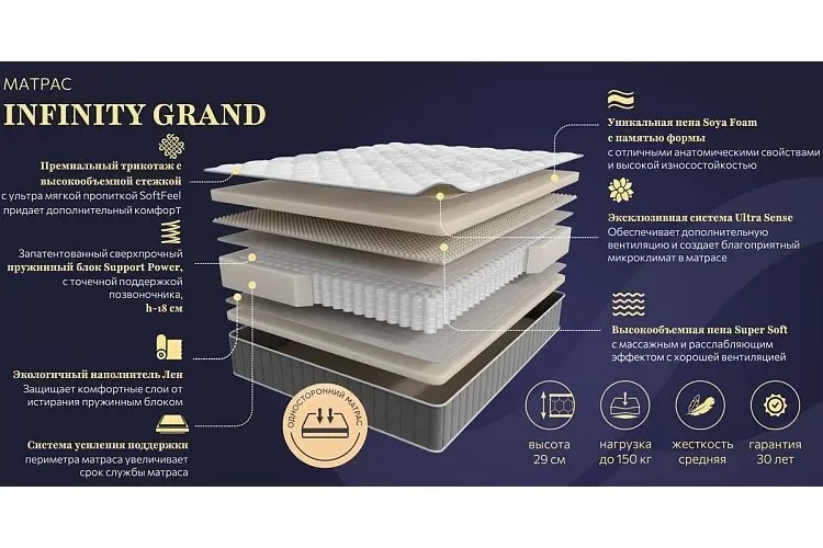 Матрас INFINITY GRAND 900*2000мм (Пена/лен, ср.жесткий, h 29см)