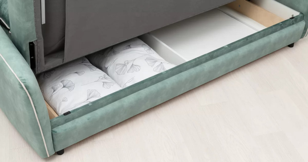 Габаритысложенный (Д x Г х В, мм): -2260 x 1090 x 920разложенный (Д x Г х В, мм): -2260 x 1340 x 750спальное место (Д x Ш, мм): -1980 x 1340высота посадки (мм): -445глубина сиденья (мм): -600высота спинки (мм): -560высота подлокотника от сиденья (мм): -150-300максимально допустимая нагрузка: -240 кг на диванМеханизм трансформации-Книжка с 0 стенойБельевой ящик-есть с перегородкой по центру (2 отделения)размер отделения (Д x Ш, мм): - 890 x 840 x 140Материалыосновная ткань: Greta (велюр)выполняется в тканях: Greta Jade (светлый хвойно-зеленый)/Greta Bone (слоновая кость)каркас: фанера-деревянный брус ДСП ДВПприспинные подушки, шт: -2съемные чехлы приспинных подушек: -естьдекоративные подушки, шт: -2наполнитель подушек: -крошка ППУ и полиэфирное волокно «шарики»цвет опор: -Опора регулируемая, круглая, чернаявысота опор (мм): -60Декор-Подлокотники с выраженным контрастным кантом по внешнему контуру изделия. Декоративные подушки оформлены декоративной отстрочкой «зигзаг».