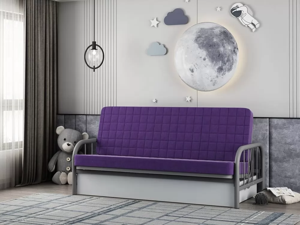 Материал: каркас — сталь, стойки боковины (труба) Ø51, основная труба лежака 40х20 мм, чехол дивана — ткань (велюр, стеганный на 100 гр холконе). Механизм разложения дивана: трехпозиционная книжка. Размер спального места, см: 120х190. Допустимая нагрузка на спальное место: 180 кг. Высота: 87 см Ширина: 200 см Глубина: 97 см Вес упаковки: 73 кг Объем упаковки: 0.526 м3