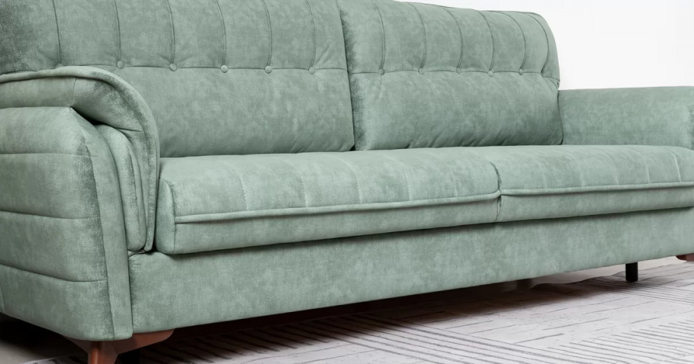 Декоративные канты на подушках дивана, подлокотниках и сиденье. Стежка на передней части сиденья и внешней части подлокотника. Защипы на верхней части подушки. Втяжки с пуговицами на приспинных подушках.