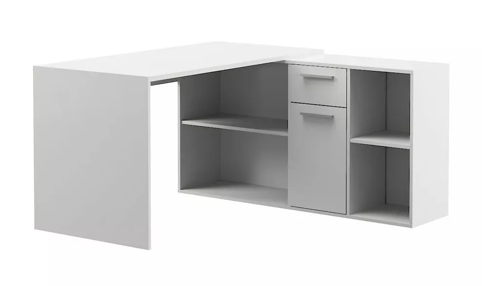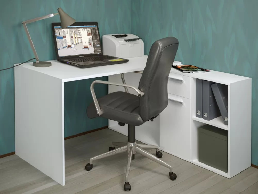 Универсальный рабочий стол, который можно собрать как в угловой, так и в прямой ориентации. Широкая столешница позволит свободно разместить ноутбук, настольную лампу и письменные принадлежности. Система хранения стола состоит из тумбы с четырьмя открытыми нишами разного размера, одного закрытого шкафчика с полкой внутри и выдвижного ящика.