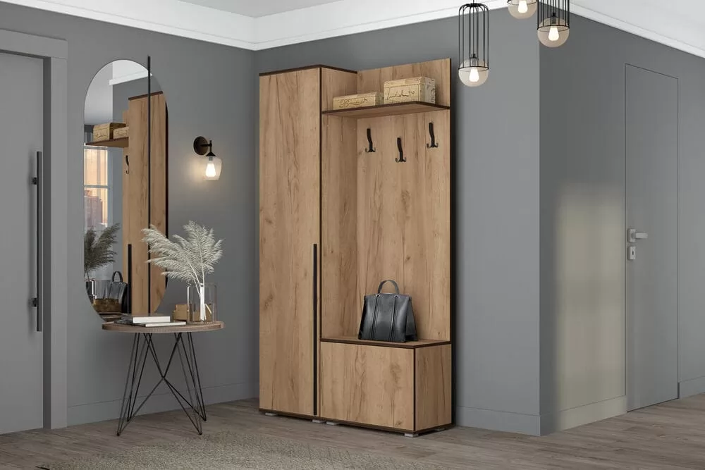 Строгая и элегантная прихожая "Норден" идеально подойдет для небольшого пространства Вашего холла. Все детали изделия отделаны контрастной кромкой (крафт золотой-кромка венге; крафт белый - кромка графит), что в сочетании с черными крючками и металлической ручкой подчеркивает модный дизайн данной прихожей. Дверца обувницы открывается при помощи системы push-to-open (нажатием) и секретерного газлифта.