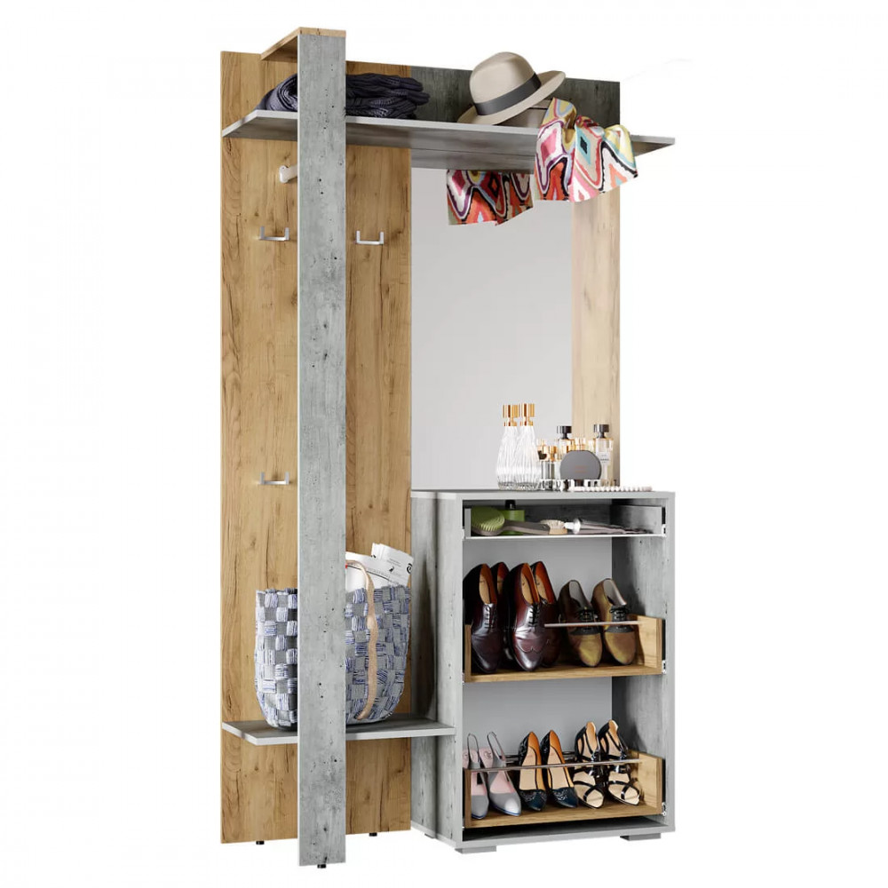 на открытой панели со штангой, крючками и полками найдется место для верхней одежды, сумок, шарфов и зонтов,