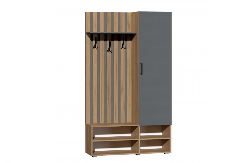 Очень функциональная прихожая, выполненная в современном сочетании теплой древесной текстуры с глубоким серым цветом - дуб крафт золотой с графитом. Ширина отдела с крючками - 70 см, где удобно размешать верхнюю одежду. В отделе со створкой имеется выдвижная штанга размером 350 мм и ниша для размещения шапок, перчаток, шарфов и прочего Контрастные черные ручки размером 128 мм. В нижней части прихожей открытые ниши для обуви. Современной оформление открытой части с крючками - эффект реек на фоне заднего щита из контрастного цвета материала.