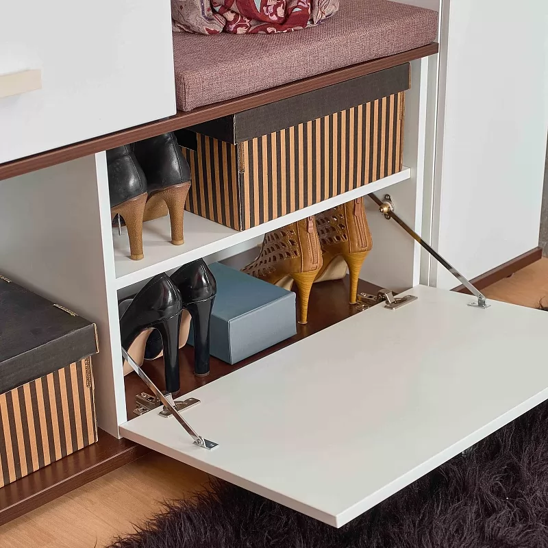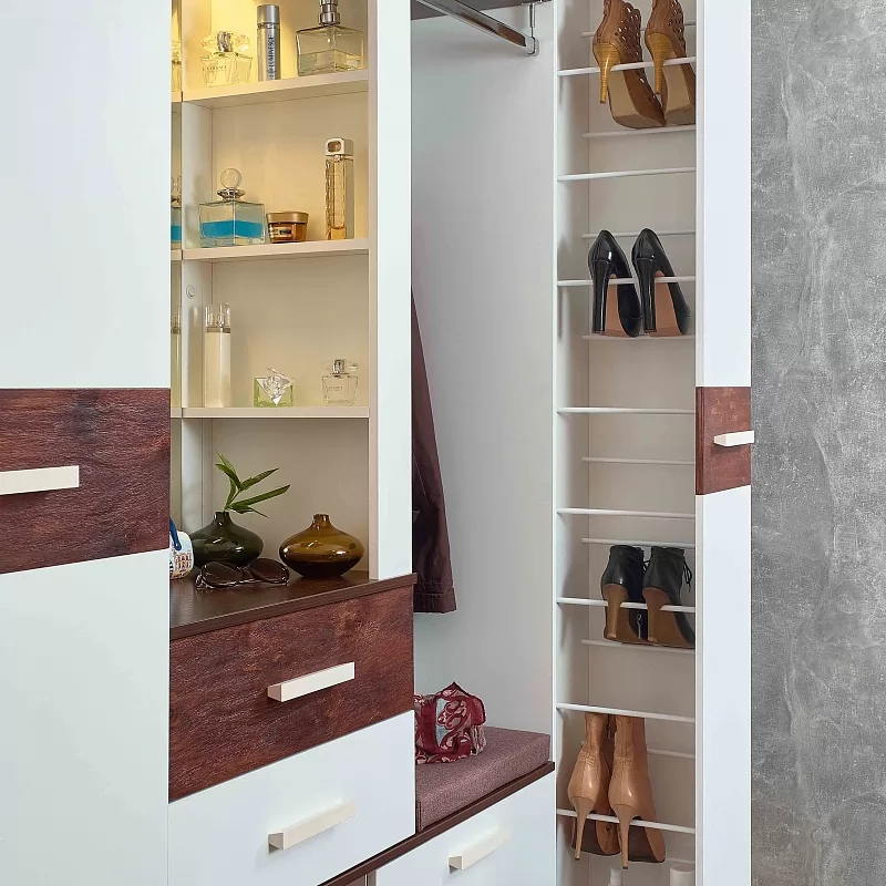 Гибкая линейка прихожей Норвуд позволяет найти множество изобретательных способов задействовать даже самое скромное пространство, что особенно уместно в крошечных входных зонах. В прихожей Норвуд Белый декор используется в качестве основного цвета. При этом помещение не будет выглядеть просто, так как в дизайне модулей Норвуд используются контрастные горизонтальные поверхности и брашированные деревянные вставки в декоре Орех Шоколадный. Выразительное сочетание актуальных декоров не останется незамеченным и привнесет теплоту в атмосферу вашего дома. Деревянные брашированные вставки в декоре Орех Шоколадный покрыты лаком, который подчеркивает рельефную структуру поверхности.