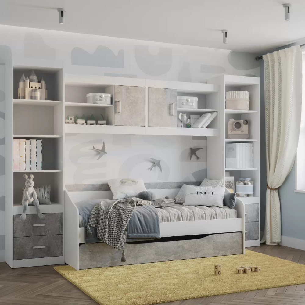 Модель открытого шкафа Паскаль состоит из нескольких открытых полок и двух закрытых ящиков.