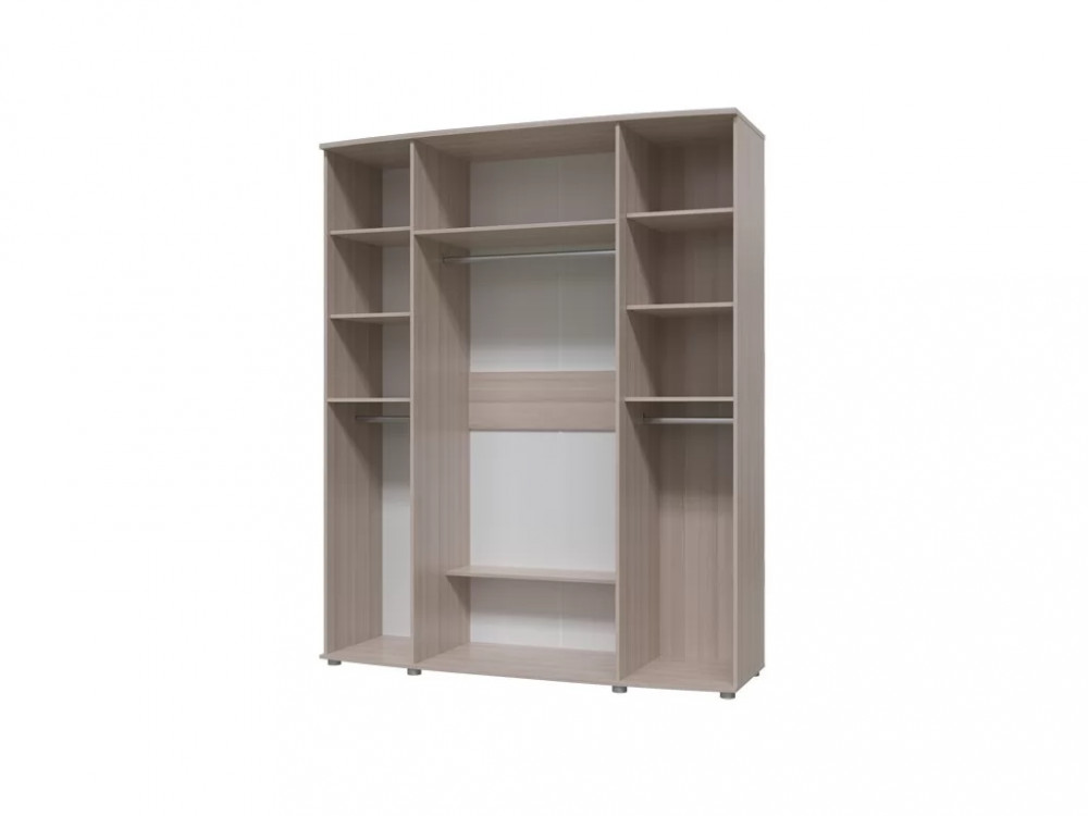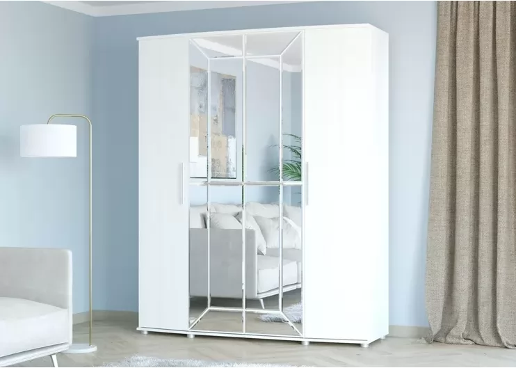 Шкаф с распашными дверями, с двух сторон отделение с тремя антресольными полками и горизонтальными штангами под ними. В центре шкаф украшают зеркала из 12-ти сегментов, внутри расположены антресольная полка, горизонтальная штанга и нижняя полка.