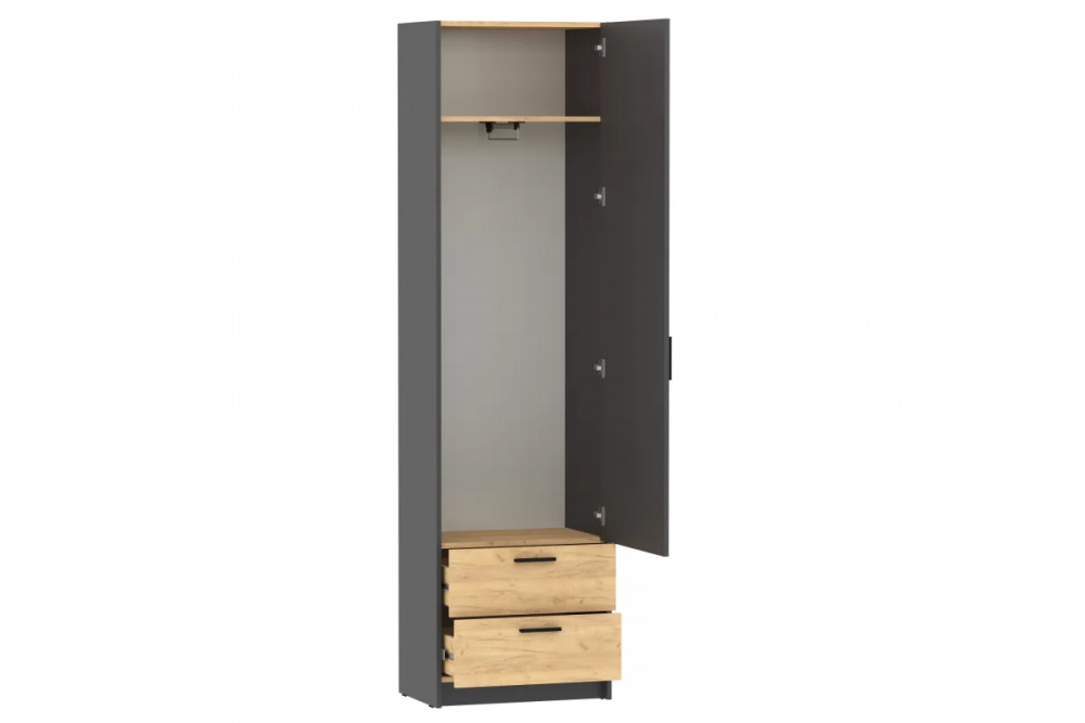Шкаф оснащен полкой для хранения вещей, двумя выдвижными ящиками с шариковыми направляющими, за счет которых они выдвигаются плавно и бесшумно, а также выдвижной штангой, которая позволяет комфортно размещать предметы гардероба. Шкаф является модульным, что позволяет комбинировать его с другими шкафами и тумбами из одноименной коллекции. Лаконичный дизайн шкафа гармонично подчеркивается черными ручками.