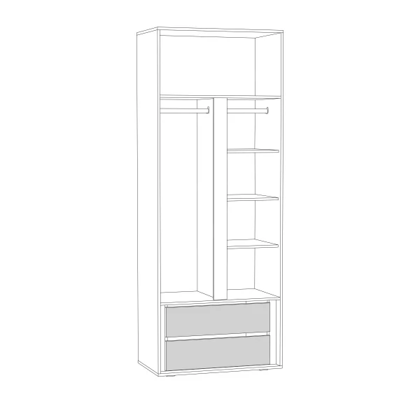 Шкаф "Муссон" 13.198 - это универсальный вместительный шкаф, оснащенный дверями, отделением со штангой для одежды и двумя полками, сверху и снизу, а также отделением с полками для хранения вещей и белья.