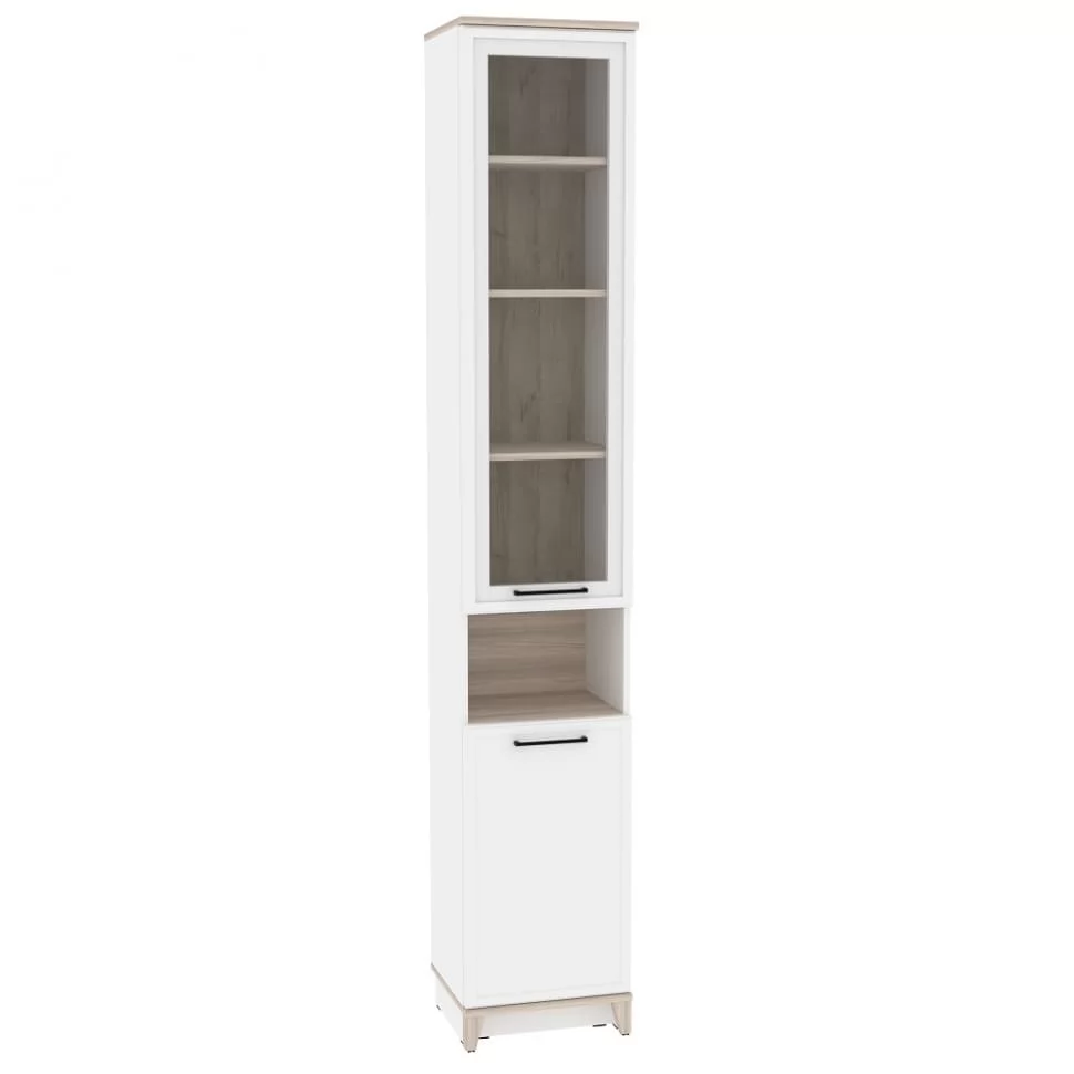 Ширина (мм): 400 Высота (мм): 2308 Глубина(мм): 355 Цвет корпуса: Белый-Блеквуд Сатиновый, Антрацит-Блеквуд Сатиновый Ручка-скоба металлическая (черный матовый) нагрузка на полку (кг): до 10 Материал корпуса: ЛДСП Материал фасада / вставок: ЛДСП,стекло