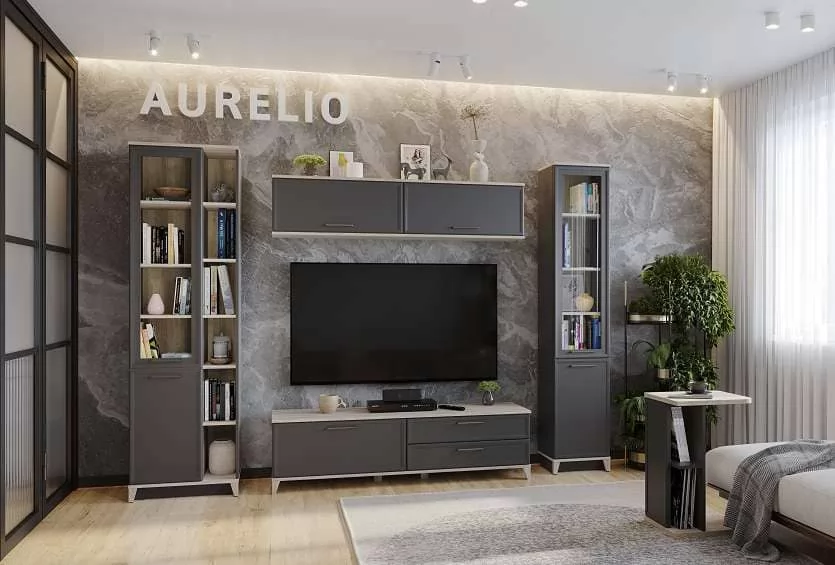 Мебель AURELIO представляет собой классическую мебель в современном исполнении. Корпус мебели изготовлен из высококачественного ЛДСП толщиной 16 мм, что обеспечивает прочность и долговечность конструкции. Фасады выполнены из МДФ с применением профиля, что придает им изысканный и стильный вид. Особое внимание стоит уделить рамочным фасадам шкафов, которые украшены стеклянными вставками и металлическими черными ручками. Это сочетание материалов придает мебели особый шарм и элегантность.