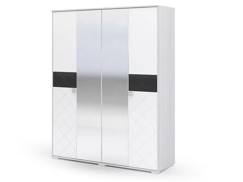 Четырехстворчатый шкаф ШК 024 входит в модульный ряд спальни Сальма. Шкаф Сальма современный и оригинальный, благодаря необычным фасадам, выполненным в декоре Белый глянец с графическим узором линейки и вставкой из стекла черного цвета-лакобель.