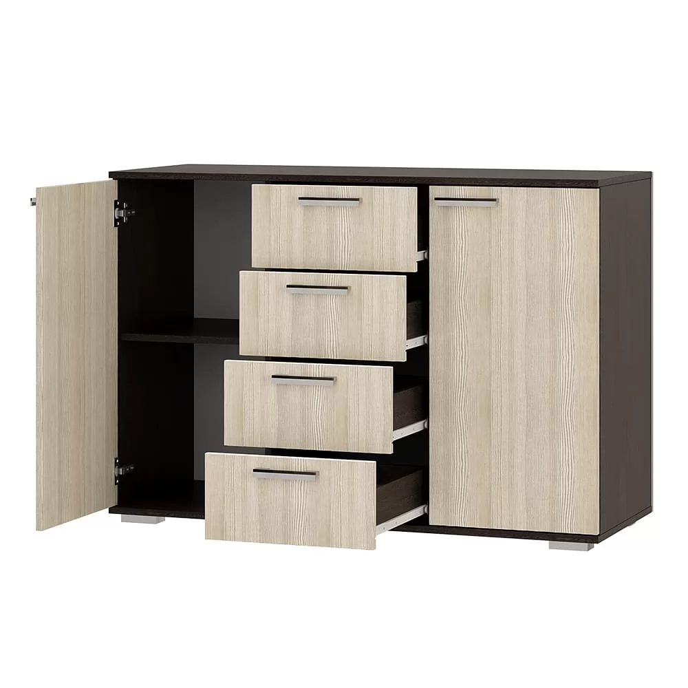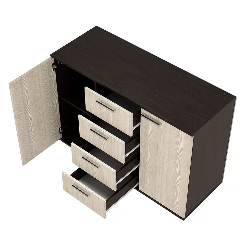- данная модель состоит из четырех центральных выдвижных ящиков, а также двух боковых секций с распашными дверцами,