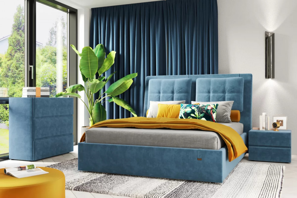 Кровати выполнены в нейтральных и в ярких тканях велюр, что позволяет подобрать подходящий вариант почти под любой интерьер. В качестве декора применяются декоративные подушки на изголовье.