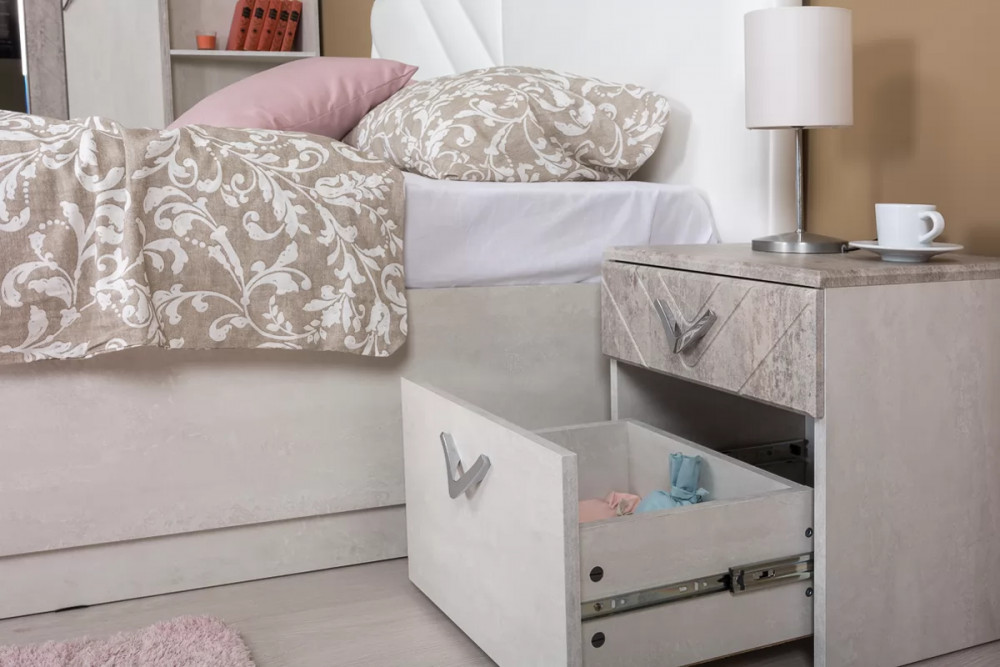 Прикроватная тумба "Амели" оснащена двумя ящиками разной глубины. Столешница, выполненная из МДФ, износостойкая и долговечная.