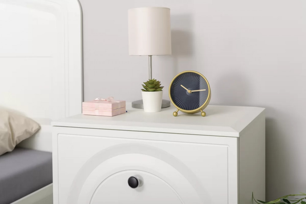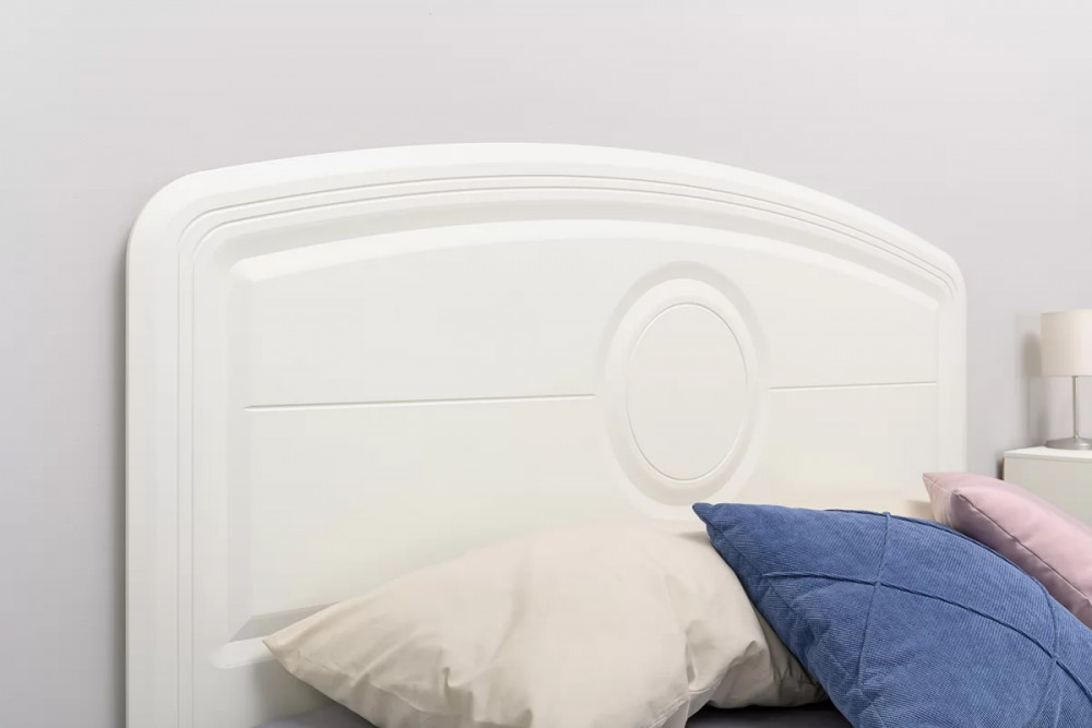 • Основным декоративным элементом коллекции является круг. Явно представленный фрезеровкой по фасадам тумбы, комода, в изголовье кровати и ручках-кнопках.