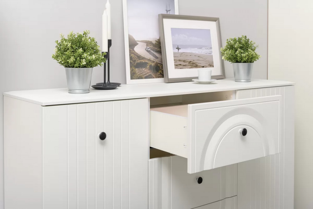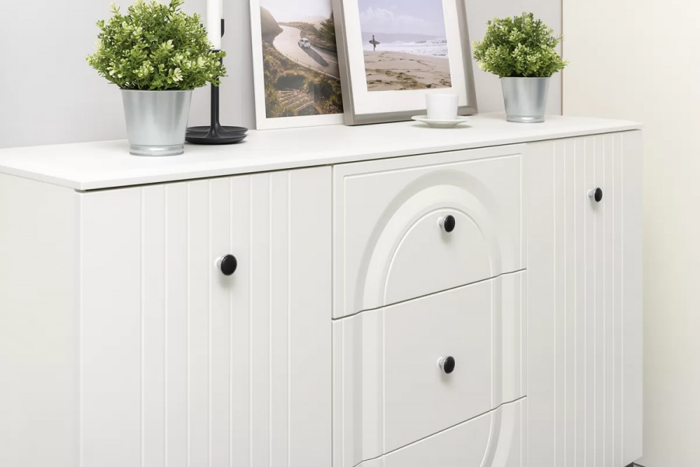 • Вся лицевая фурнитура металлическая, графичное и стильное сочетание черного и хромированных деталей эффектно расставляет акценты на мебели.