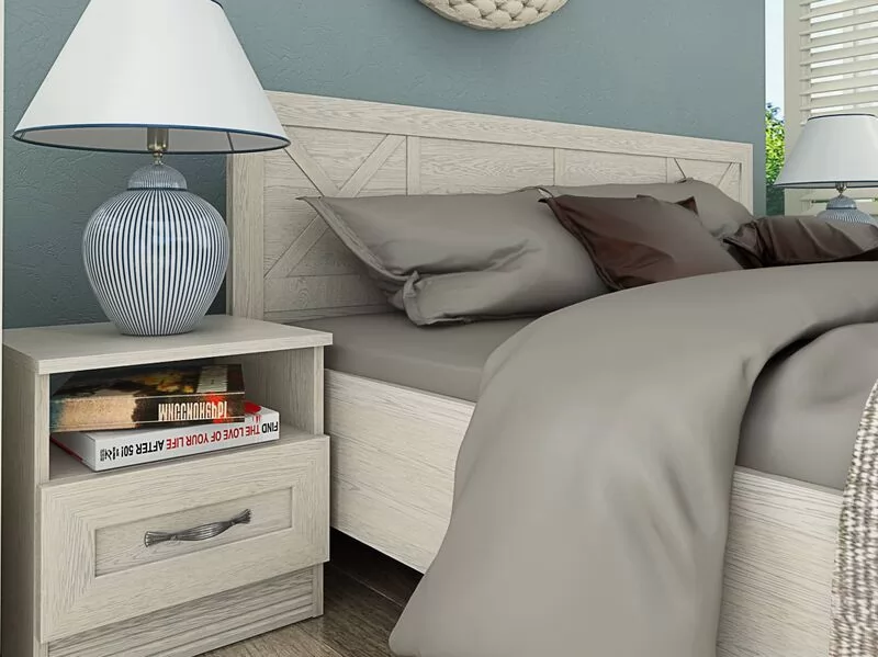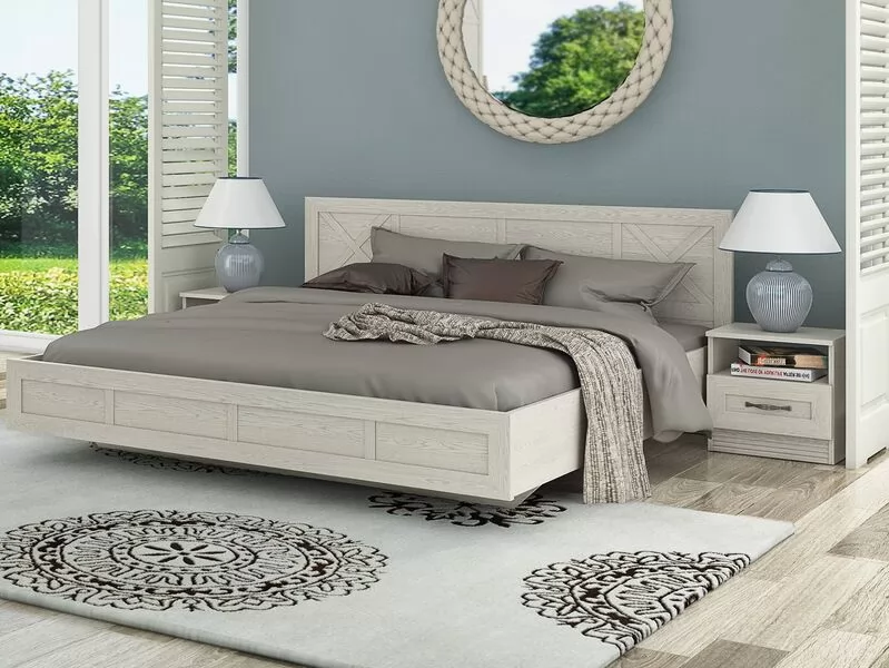 гарнитура входят две прикроватные тумбы с открытыми нишами и каркас кровати со спальным